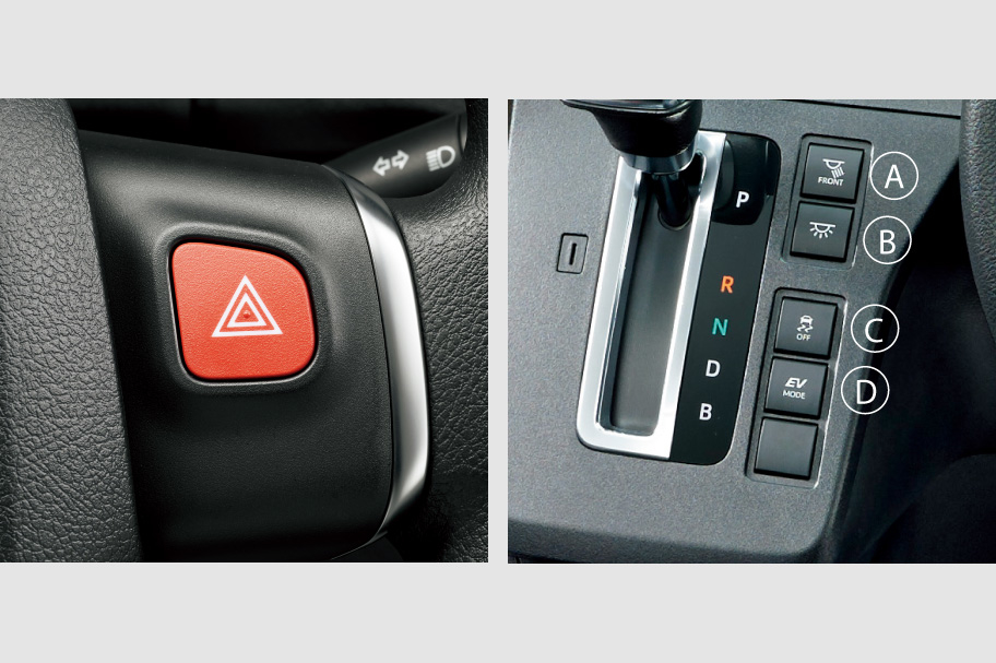 ハザードスイッチは押しやすいステアリング右側に設定。使用頻度の高いスイッチはシフト横に集約しています。