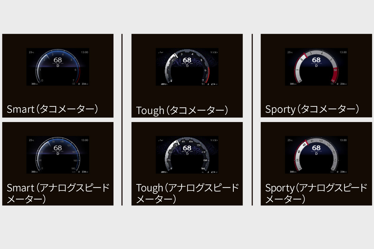 タコメーター、アナログスピードメーターを、Smart/Tough/Sportyの3つのテイストで表示可能。マルチインフォメーションディスプレイの中央に情報を集約した、シンプルで操作しやすいメーターです。