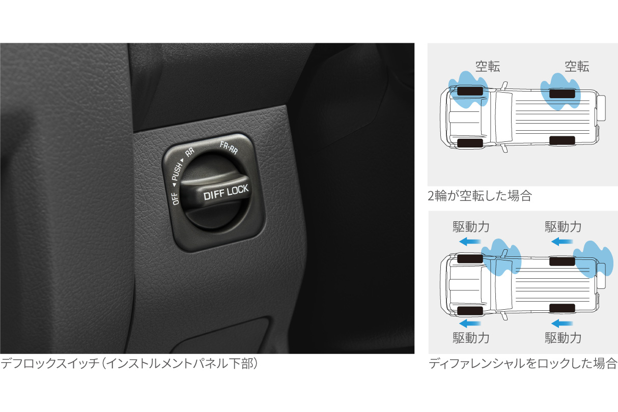 車輪をスタックさせると、デフの働きによってその車輪が空転し駆動力が伝達されず、脱出が難しくなります。デフをロックすることにより反対側の車輪にも駆動力が伝わり脱出が可能となります。電動デフロックは、スイッチ操作でリヤデフ、またはリヤデフとフロントデフ両方をロックできる機構です。